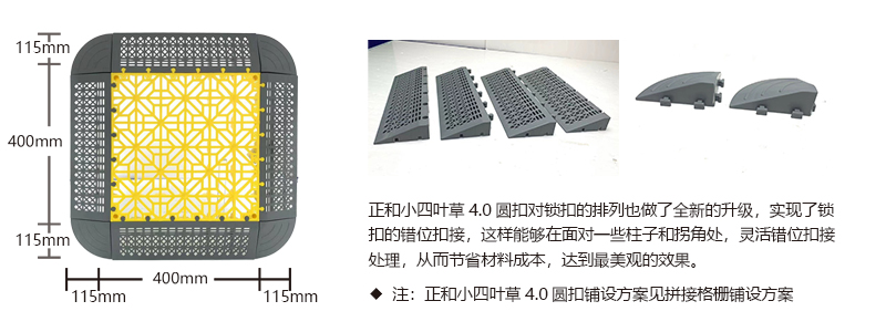 正和小四葉草4.0圓扣采用通扣設計,可以確保產品鋪設完成后在任何區(qū)域單獨取出,極大的方便了客戶后期局部清理泥沙等,給店面的日常衛(wèi)生維護提供了很好的基礎。